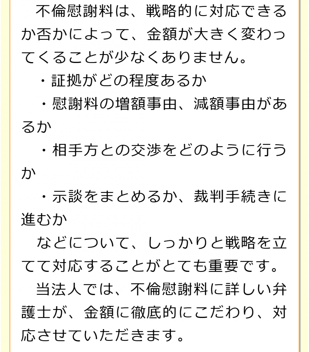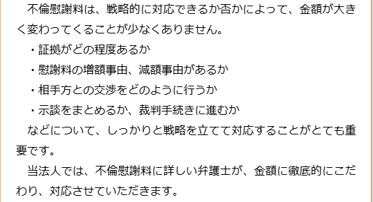 これは、不貞行為の回数、期間、子どもの有無、不倫が原因で離婚に至った、夫婦関係が円満であったか否かなど、様々なことが検討され、増額・減額事由となり得るからです。