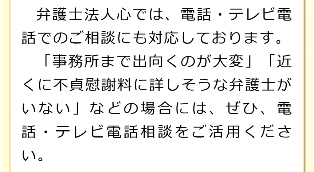 弁護士の顔が見えた方が話しやすいという場合は、テレビ電話を用いて対応させていただくことが可能です。